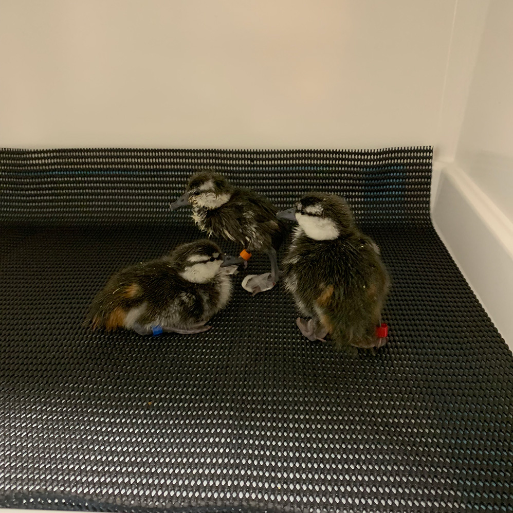 This season, one of our breeding females laid seven eggs, five of which were fertile. After careful artificial incubation, four ducklings successfully hatched between October 8–11, two of them needing tiny “moon boots” to straighten their feet.